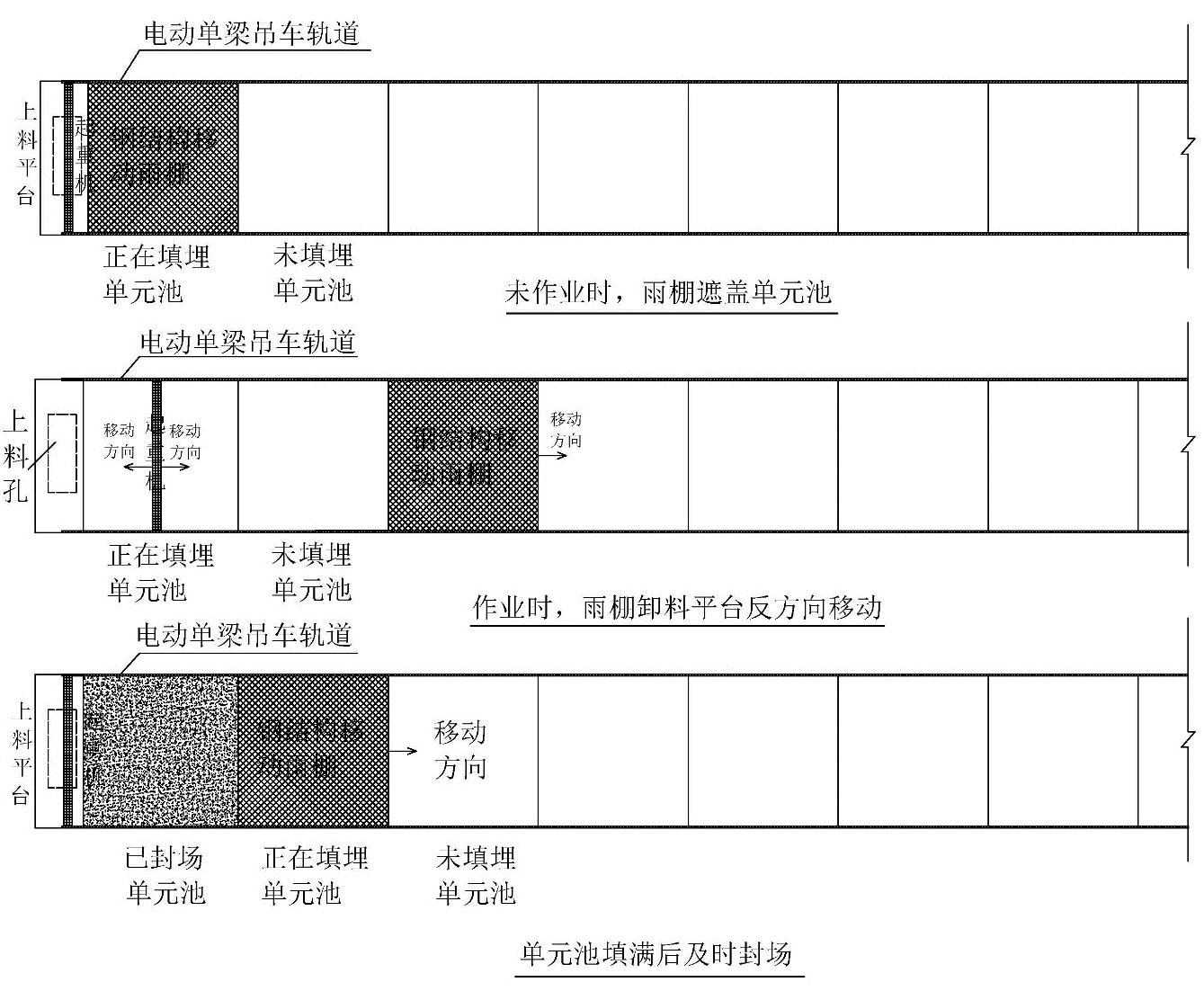 单元池上方设置雨棚及吊装机械;经鉴别符合入场要求的填埋物由运输车辆运至场内,经计量后通过环场作业道路进入填埋区,填埋物由汽车吊吊至单元池上方卸料平台,然后通过雨棚上安装的电动单梁吊车将卸料平台的填埋物填埋至单元池。汽车吊车随着单元池填埋单元的变化而移动,填埋物分层垒实。