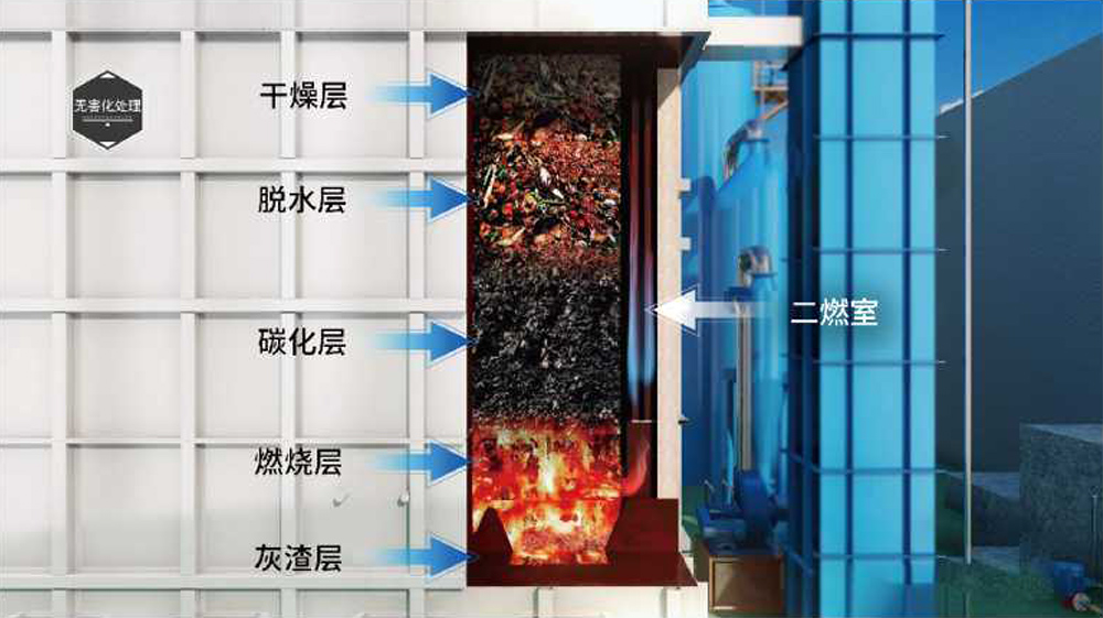 二燃室主要处理燃烧层在燃烧过程中产生的焦油和可燃气体,在高温(850C-1100C)作用下焦油和可燃气体可以被充分燃烧,燃烧的热量能够作用于垃圾的干燥、脱水和碳化,充分利用能量和减少了有害气体的产生。