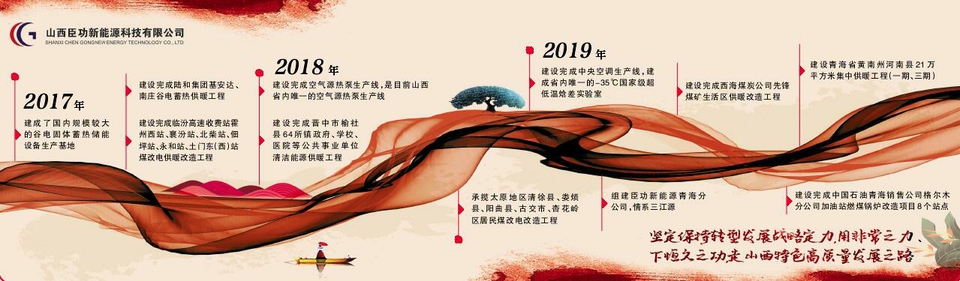 山西臣功新能源科技有限公司是山西转型综改示范区的一家专注于清洁热源领域集研发、生产、投资、运维为一体的新型节能环保企业。该公司从2014年7月成立之日起,率先顺应能源革命大趋势,积极抢抓发展机遇,加大创新力度,打造具备核心优势的特色产品,拓宽电能替代的应用领域。目前,已建成国内较大规模的固体蓄热储能设备和RHM蓄热材料研发、生产基地,建成了山西省内规模最大的空气源热泵生产基地,是国内专业的清洁热源制造商之一。